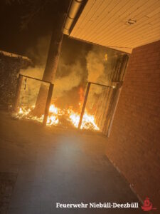 Die Feuerwehren Langstoft und Niebüll-Deezbüll wurden zu nächtlicher Stunde zu einem Gebäudebrand alarmiert. Zwei Müllcontainer sind in Brand geraten und das Feuer hat bereits vor Eintreffen der Feuerwehr auf den Anbau einer Kindertagesstätte übergegriffen. Durch einen zügigen Löschangriff von zwei Seiten durch die ersteintreffenden Löschfahrzeuge konnte das Feuer auf den bereits betroffenen Anbau begrenzt werden und das Hauptgebäude konnte geschützt werden. Es waren aufwändige Nachlöscharbeiten mit Öffnung der hölzernen Fassade und Dachöffnungen zum Ablöschen von Glutnestern erforderlich.